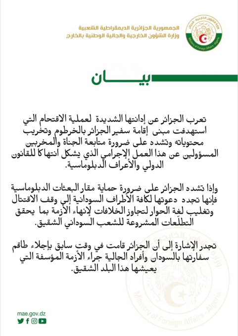 L'Algérie condamne la prise d'assaut de la résidence de l'ambassadeur d'Algérie à Khartoum.