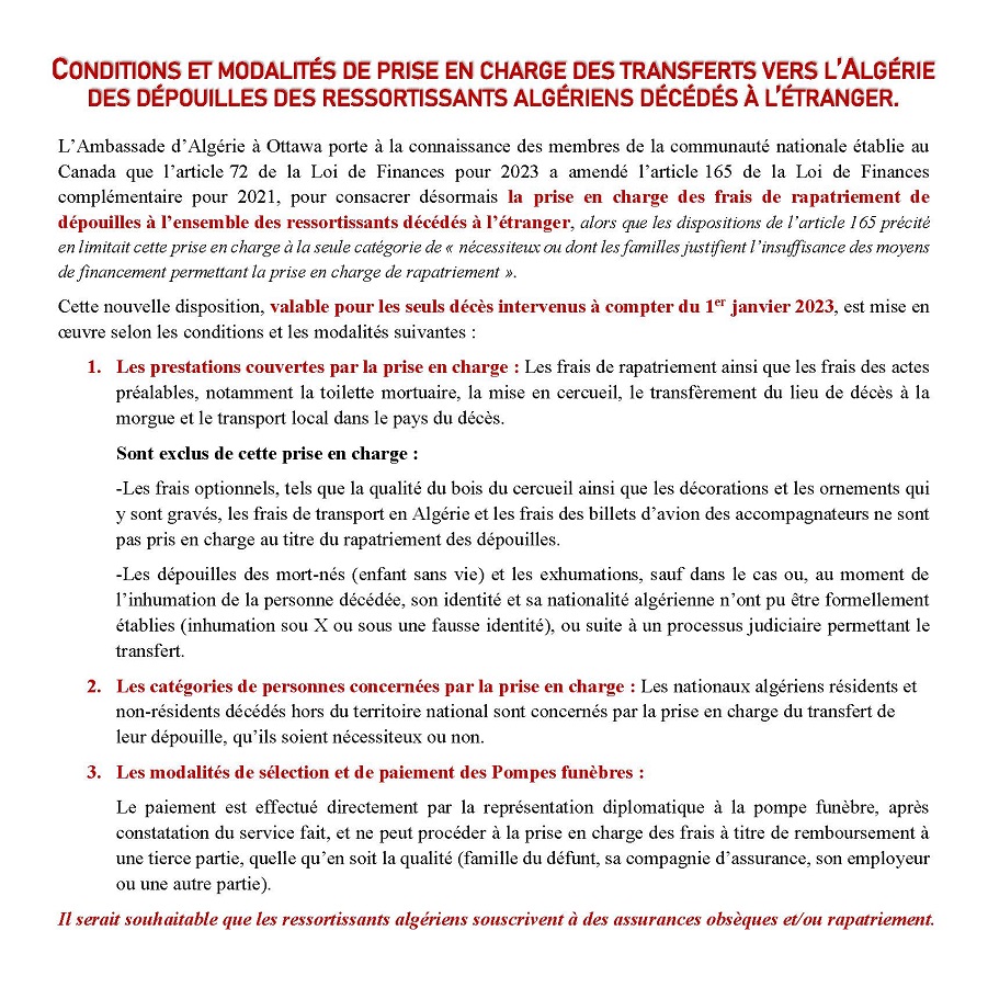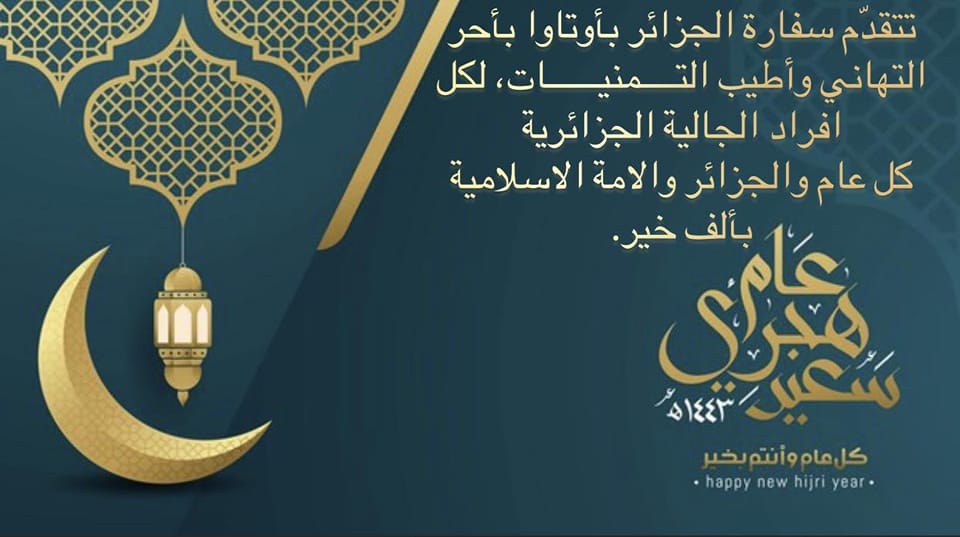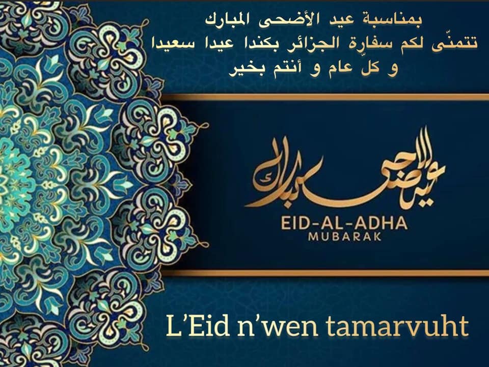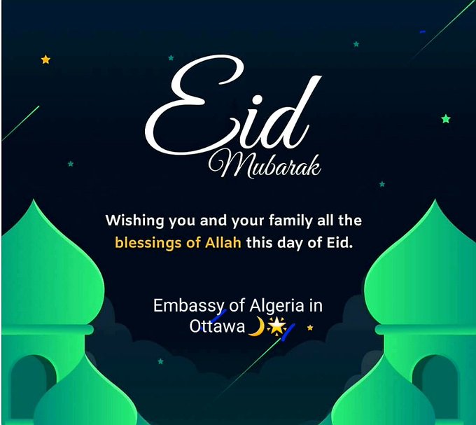 Chers (es) compatriotes, C’est avec un immense plaisir que les personnels de l’Ambassade et moi-même, adressons, à l’ensemble des membres de la communauté algérienne établie au Canada, nos vœux de bonne santé, de prospérité et de réussite, à l’occasion de la célébration de la fête de l’Aid El-Fitr...