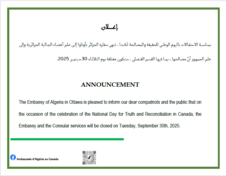 L’Ambassade d’Algérie au Canada a le plaisir d’informer les algériennes et les algériens établis au pays de l’érable, qu’à l’occasion de la célébration du déclenchement de la glorieuse Révolution du 1er Novembre 1954, le drapeau algérien sera hissé du lever au coucher du soleil, à l’Hôtel de ville d’Ottawa...