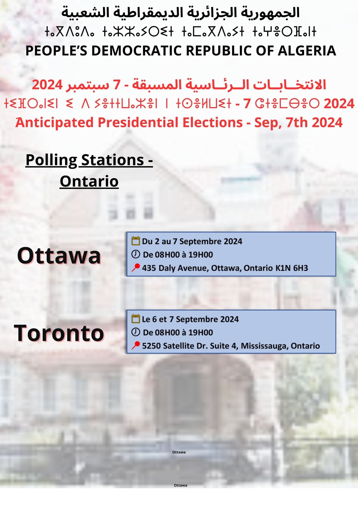 L’Autorité Nationale Indépendante des Élections porte à la connaissance des membres de la communauté algérienne inscrits sur la liste électorale et relevant de la circonscription électorale de l’Ambassade d’Algérie à Ottawa, que le scrutin des élections des membres de l'Assemblée Populaire Nationale se déroulera du Jeudi 10 juin au Samedi 12 juin 2021 de 08h00 à 19h00...