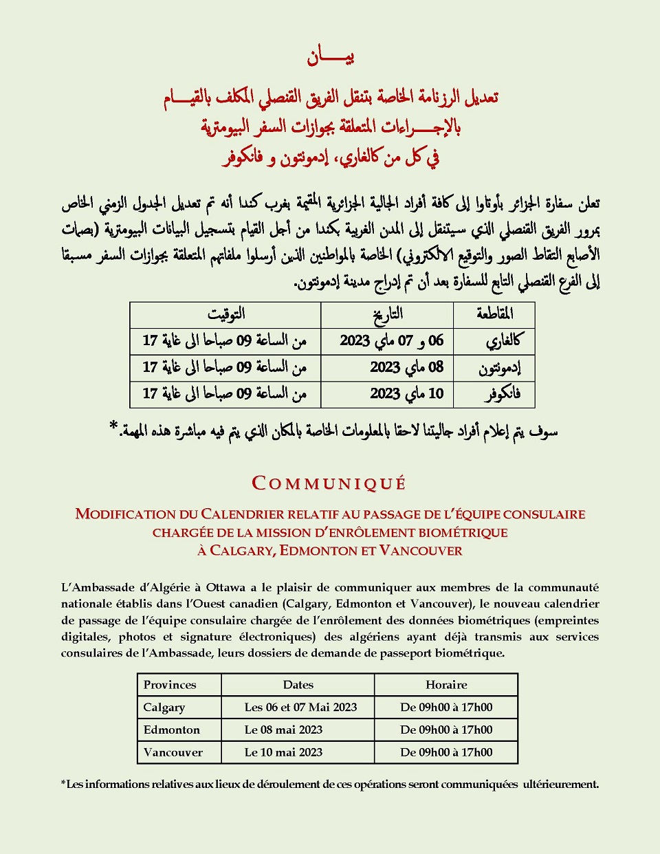 En raison du nombre insuffisant de dossiers de demandes de renouvellement de passeports parvenus à ses services, l’Ambassade d’Algérie à Ottawaque la mission d’enrôlement biométrique des ressortissants établis dans les provinces de la Colombie Britannique et de l’Alberta, initialement envisagée pour la fin du mois de mai, est reportée pour le mois de septembre 2022...
