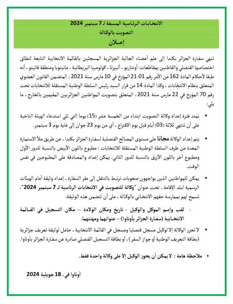 En prévision des élections législatives prévues pour le 12 juin 2021, la délégation de l'Autorité électorale nationale indépendante porteà la connaissance des citoyennes et citoyens résidant dans la circonscription consulaire de l'Ambassade d'Algérie à Ottawa, inscrits sur la liste électorale, qui ne sont pas en mesure d'exercer leur droit de vote peuvent le faire en votant par procuration...