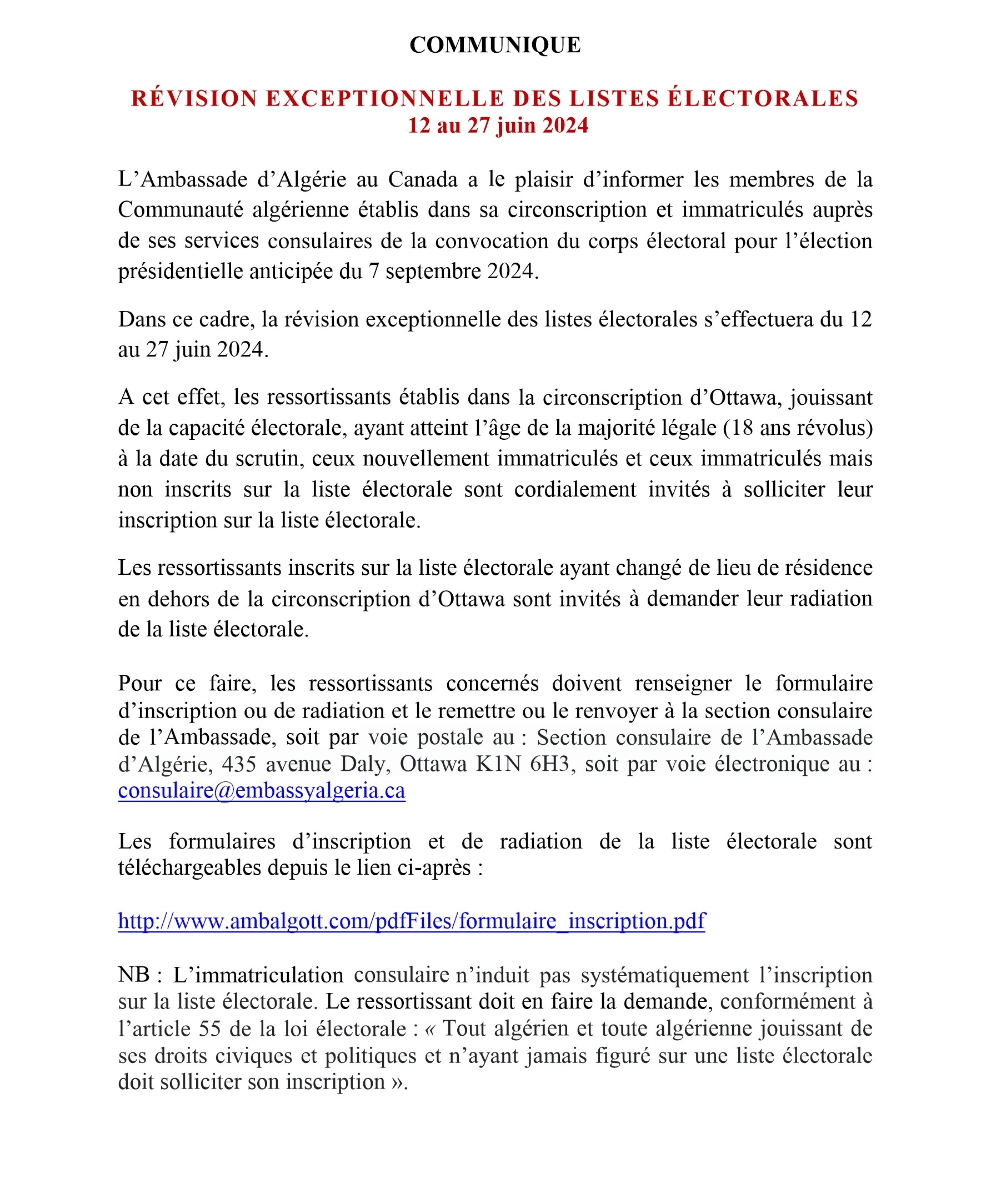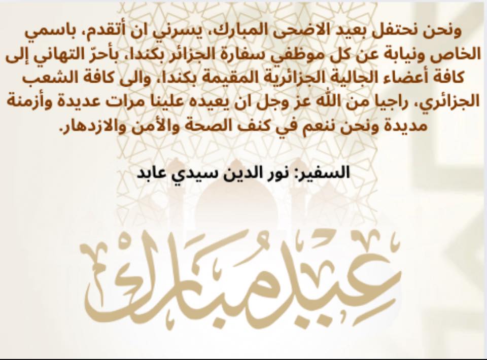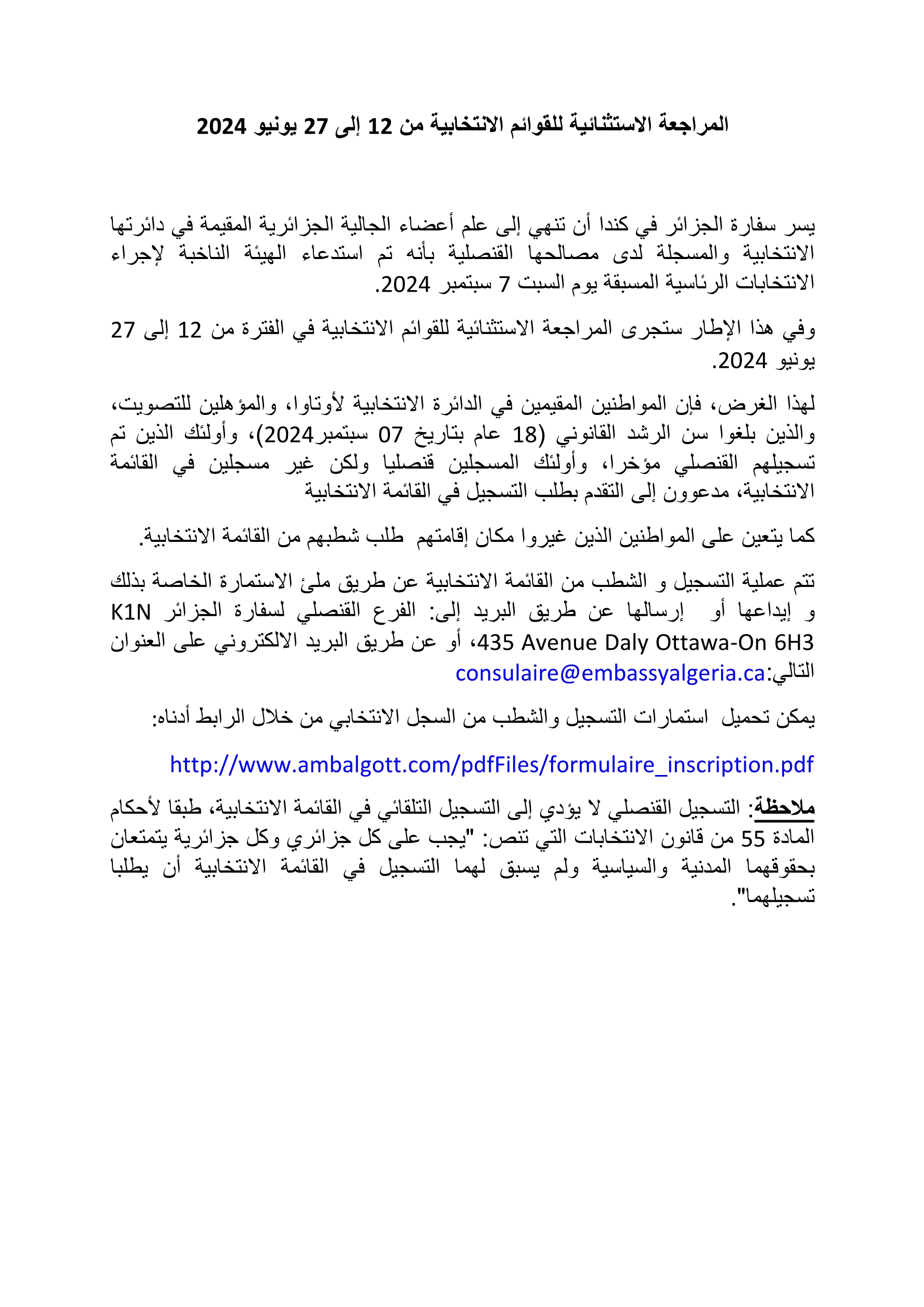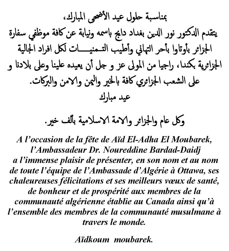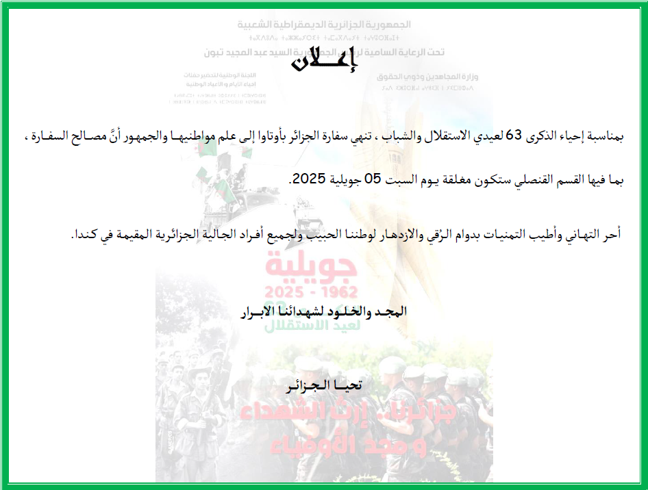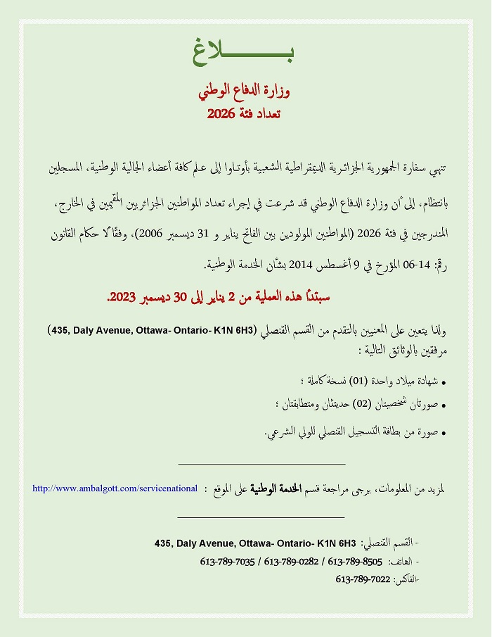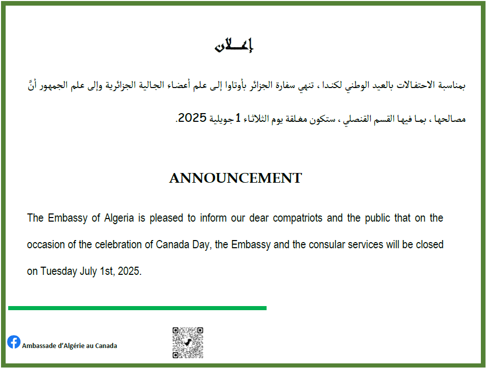 Le public et les membres de la diaspora algérienne sont amicalement invités à visiter la chancellerie algérienne sise à 500 Wilbrod St, Ottawa, ON K1N 6N2.