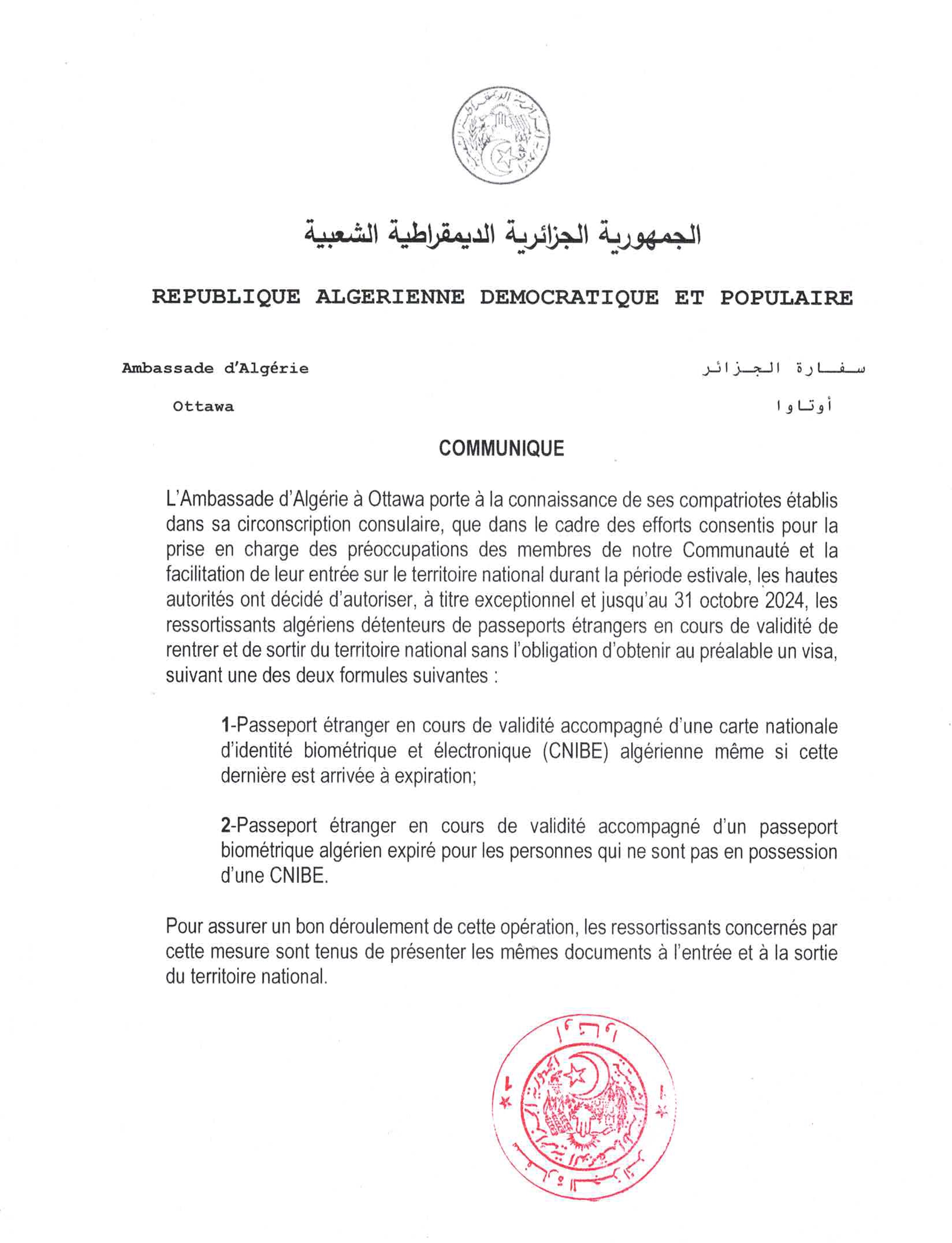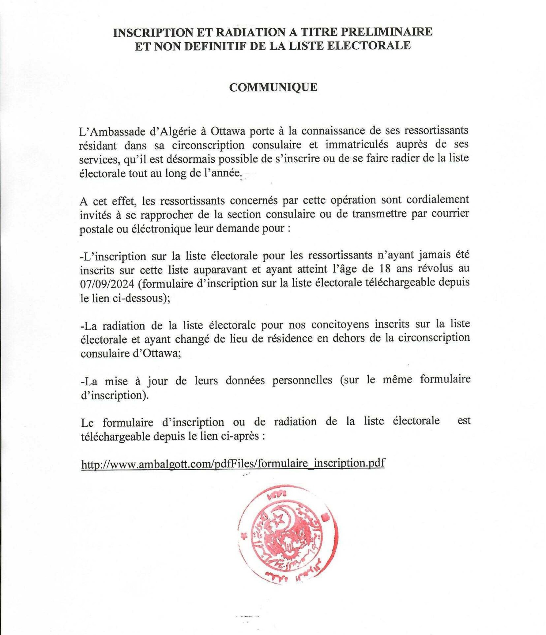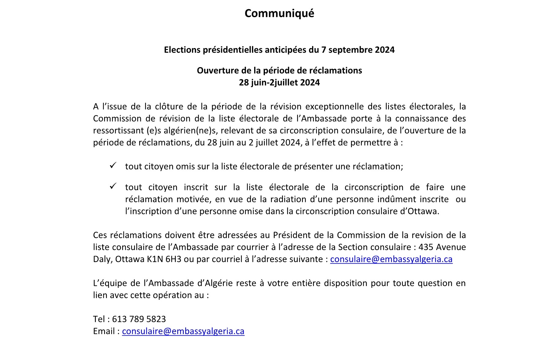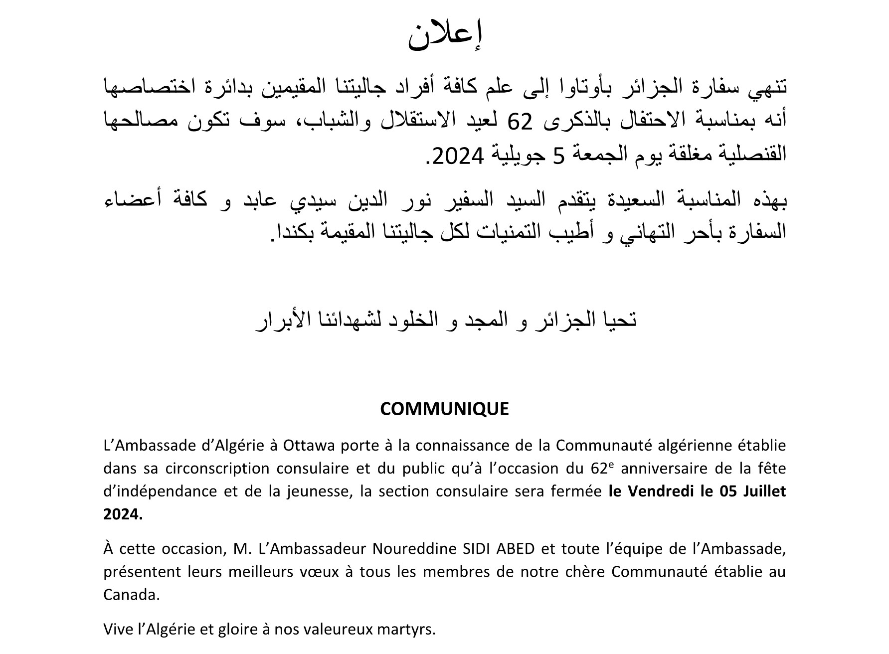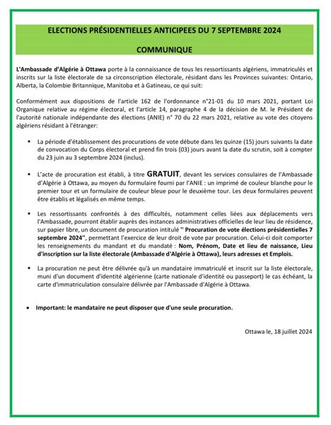 Le public et les membres de la diaspora algérienne sont amicalement invités à visiter la chancellerie algérienne sise à 500 Wilbrod St, Ottawa, ON K1N 6N2.