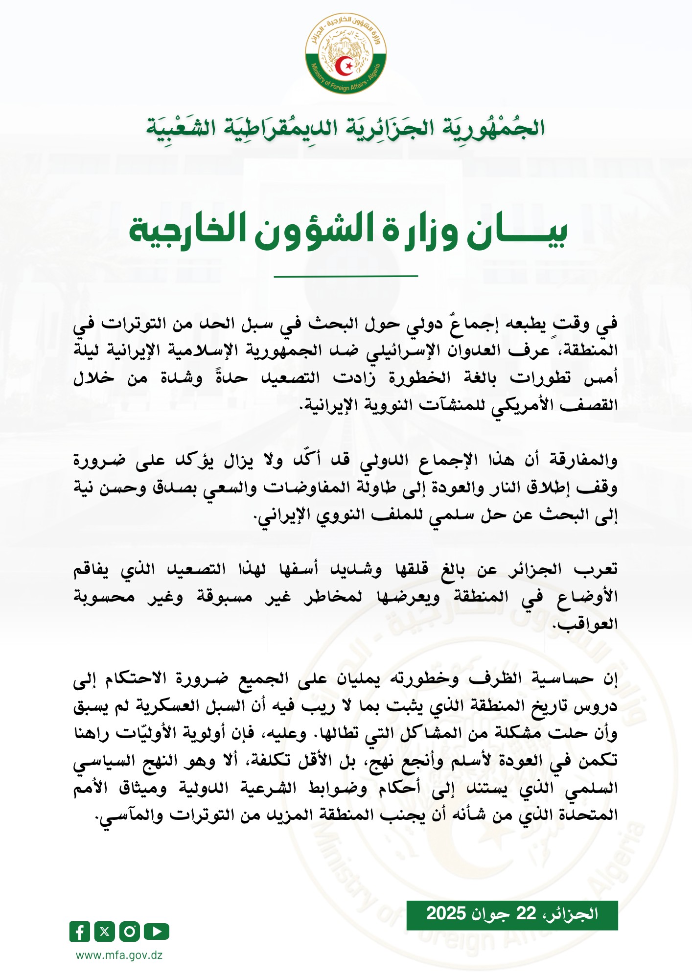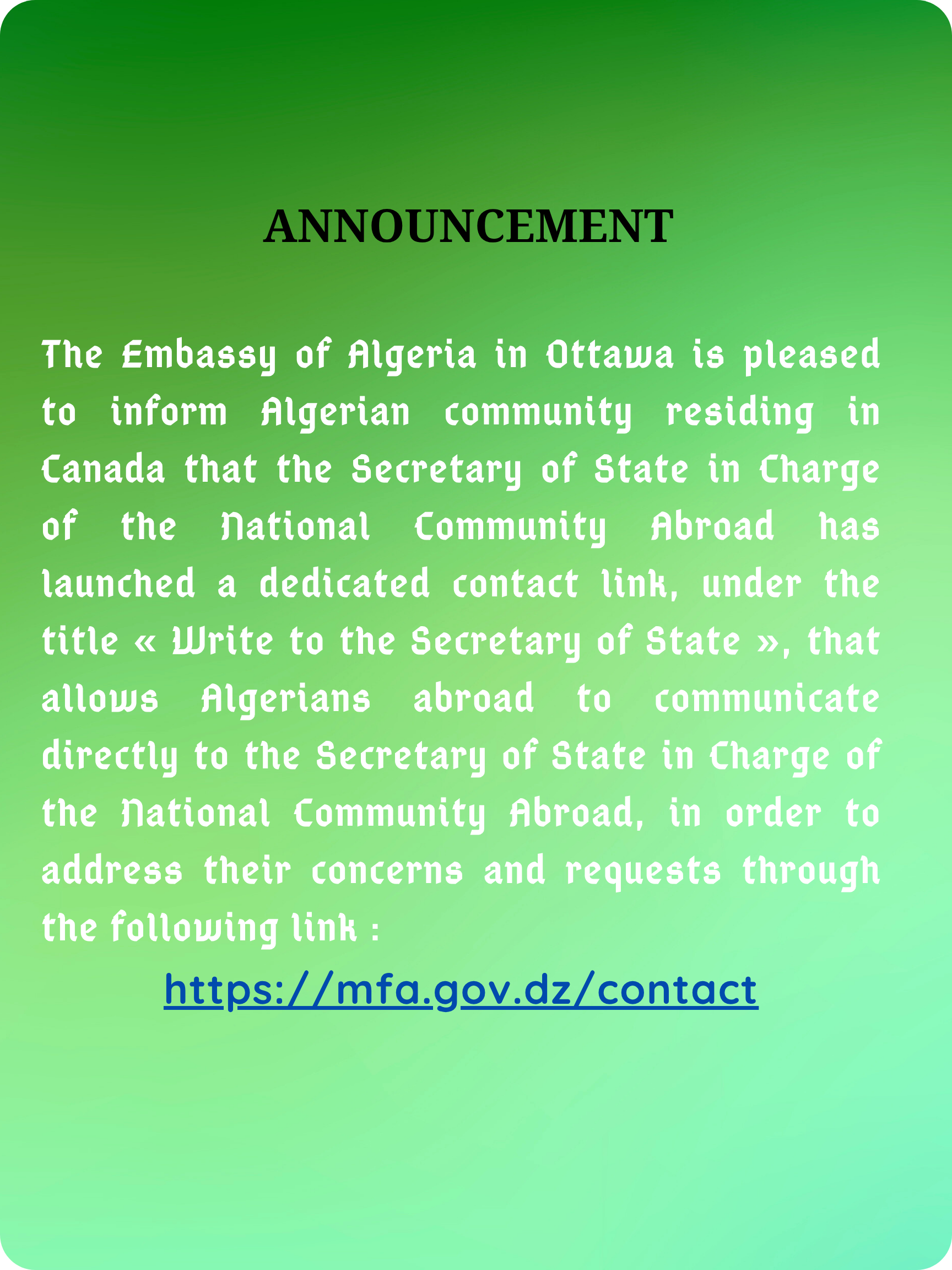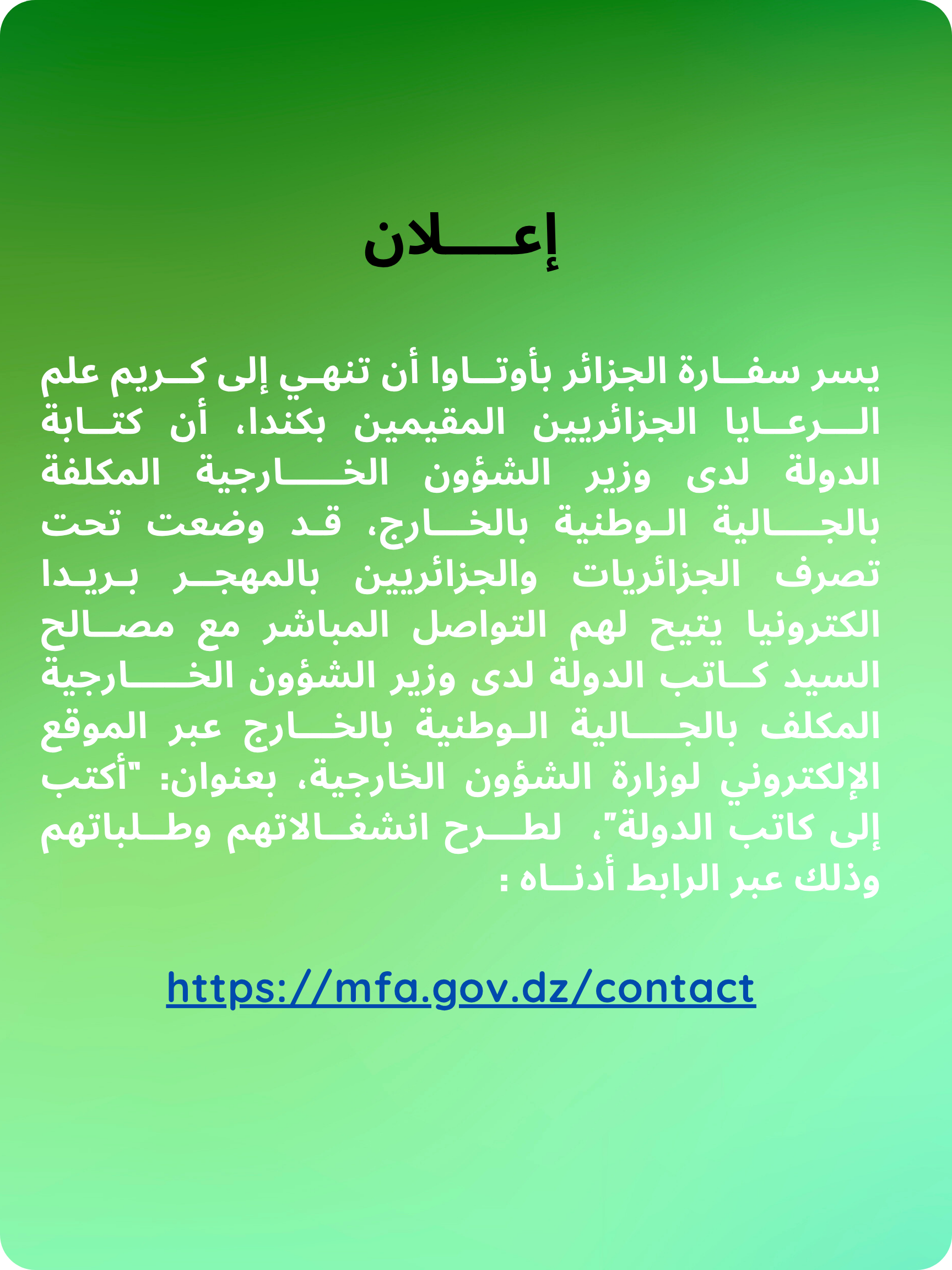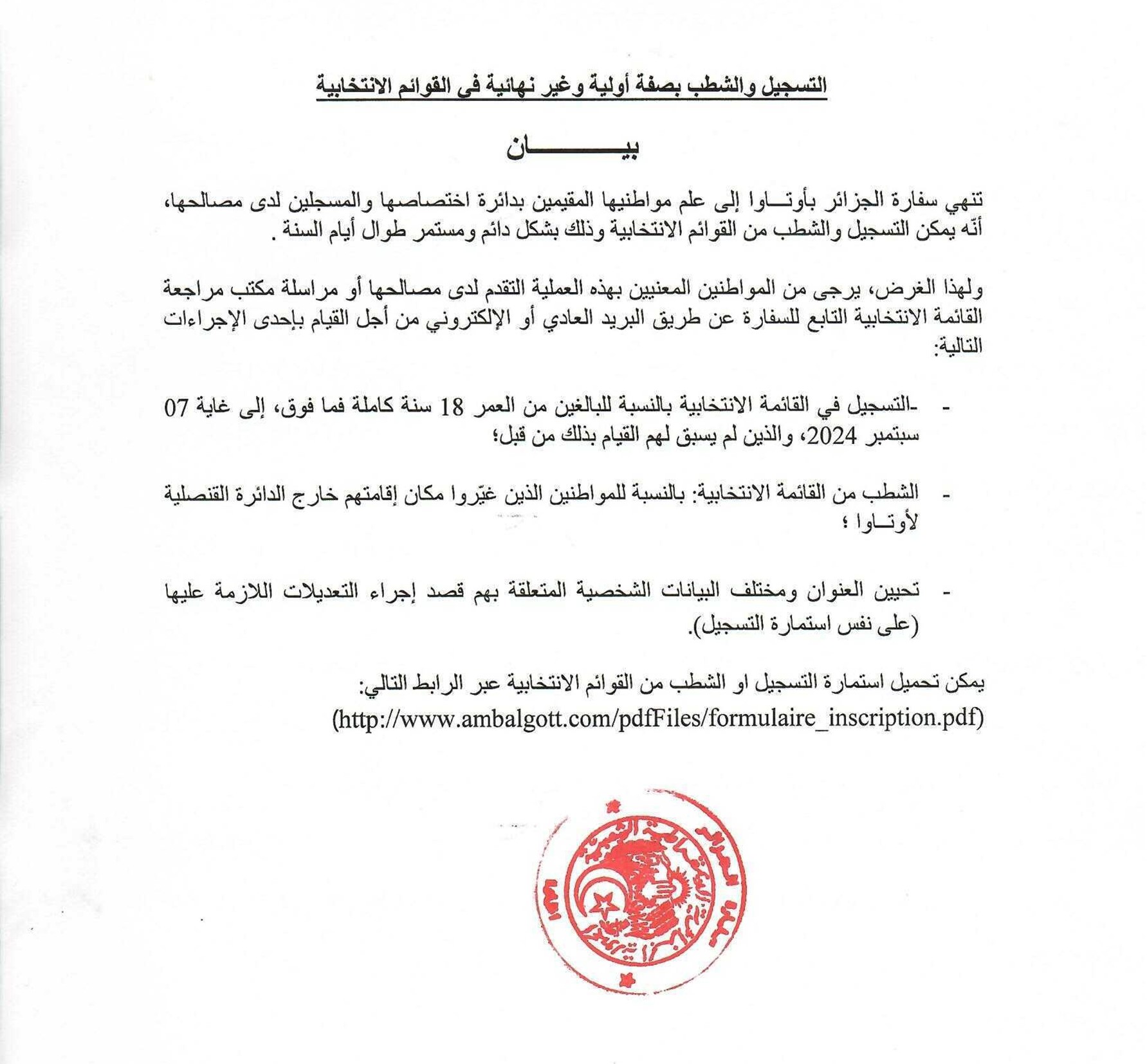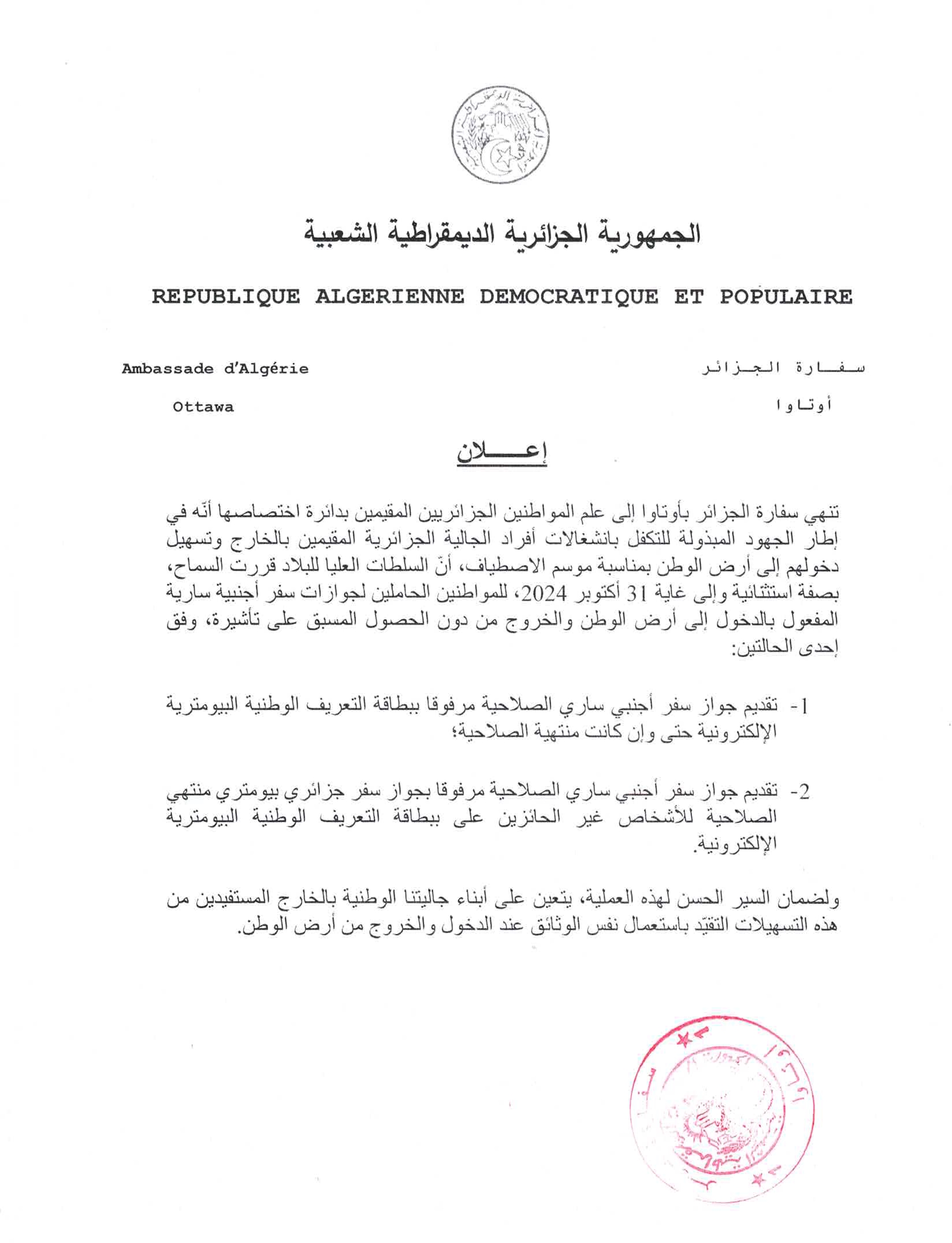 Le public et les membres de la diaspora algérienne sont amicalement invités à visiter la chancellerie algérienne sise à 500 Wilbrod St, Ottawa, ON K1N 6N2.