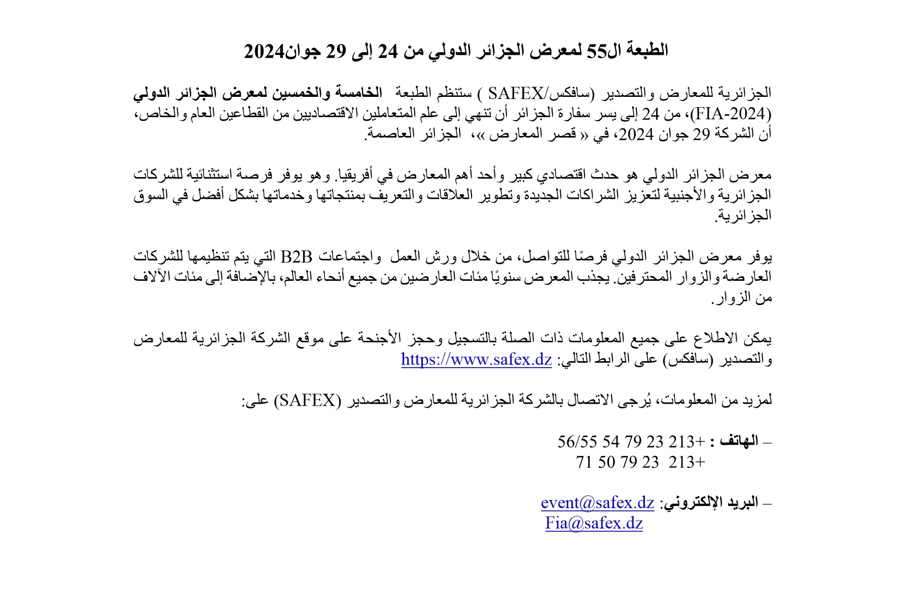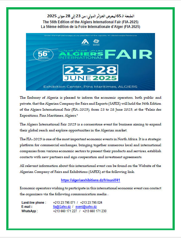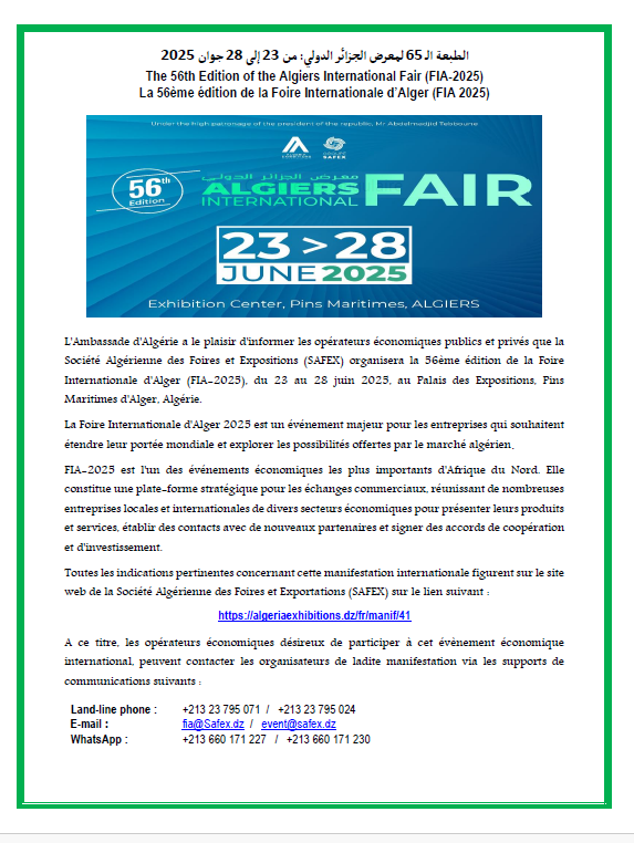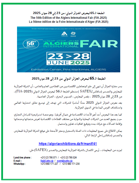 Il est porté à la connaissance des opérateurs économiques que l’Agence Nationale de Promotion du Commerce Extérieur (ALGEX)