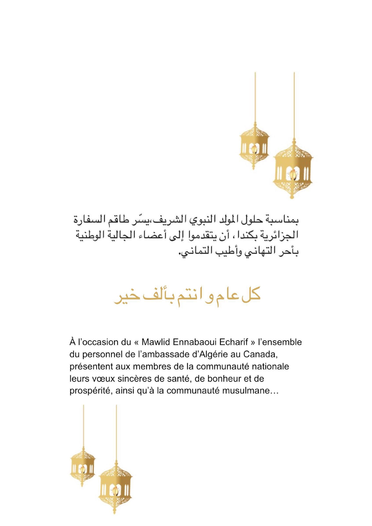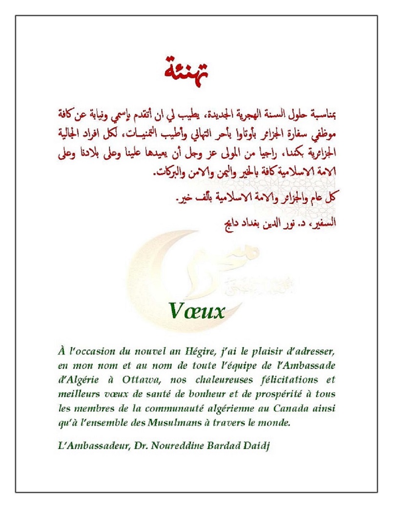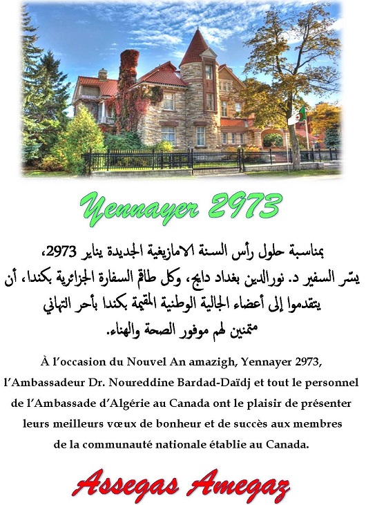 L’Algérie toute entière célèbre, ce 12 janvier 2018, la fête de Yennayer. C’est donc une occasion idoine pour l’Ambassade d’adresser à tous les membres de la communauté nationale établie au Canada ses