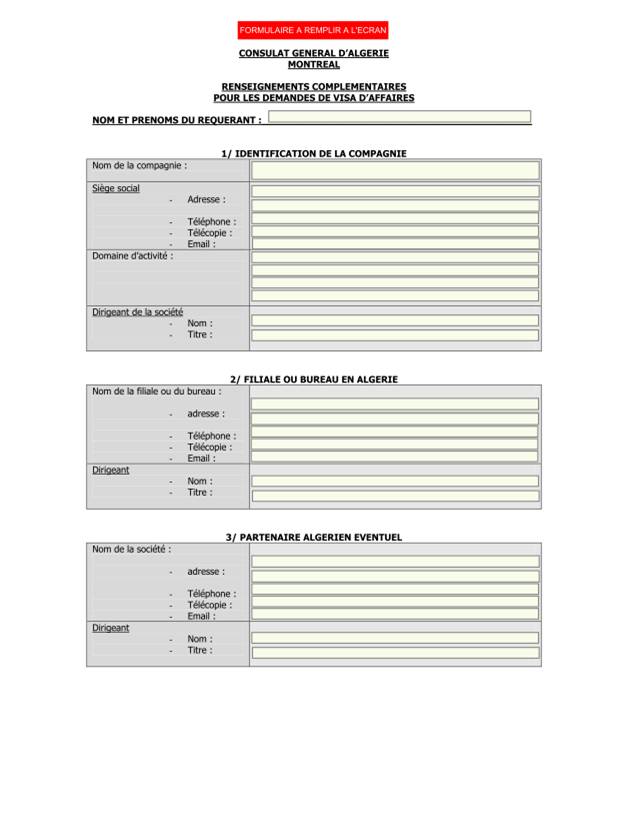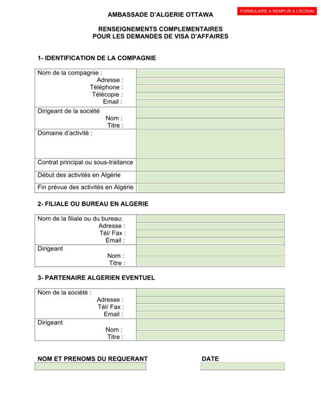 - Formulaire de renseignements complémentaires pour demande de visa à caractère professionnel: